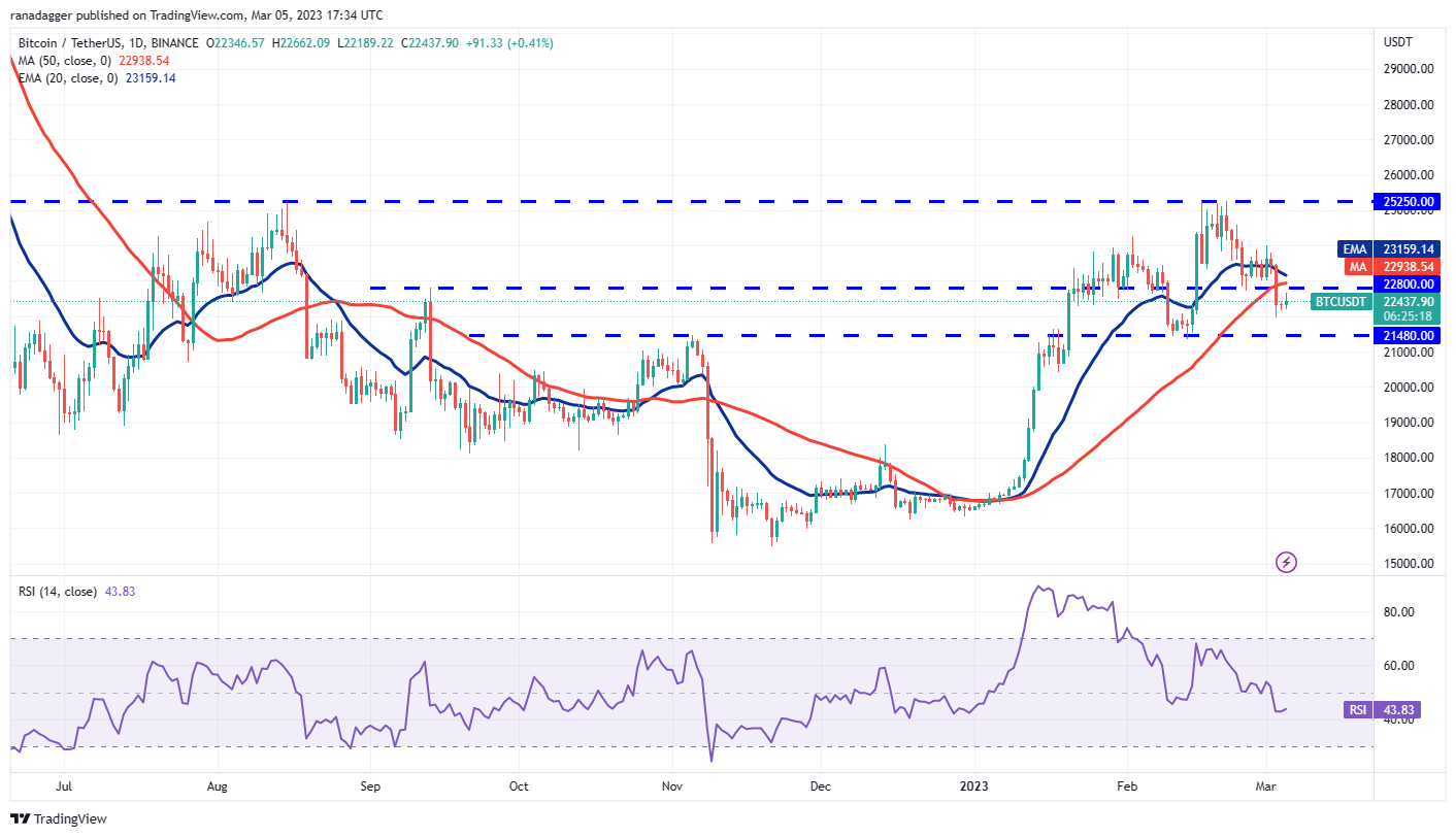 비트코인은 3월 3일 지지선인 22,800달러 아래로 급락했습니다. 3월 5일 매수자들은 가격을 지지선 위로 끌어올리려 했지만, 캔들스틱의 긴 심지는 하락세가 22,800달러를 저항선으로 전환하려 한다는 것을 시사합니다.