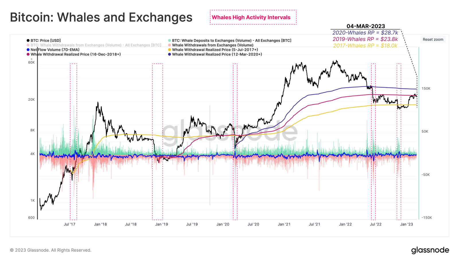 아래 차트는 거래소로 들어오고 나가는 코인만 고려한 웨일 코호트의 평균 획득 가격을 간략하게 보여줍니다. 추적은 다음과 같은 주요 시장 바닥에서 측정을 시작하여 각 사이클 기간 동안 가장 유리한 평균 웨일 획득 가격을 제공하기 위해 노력합니다.