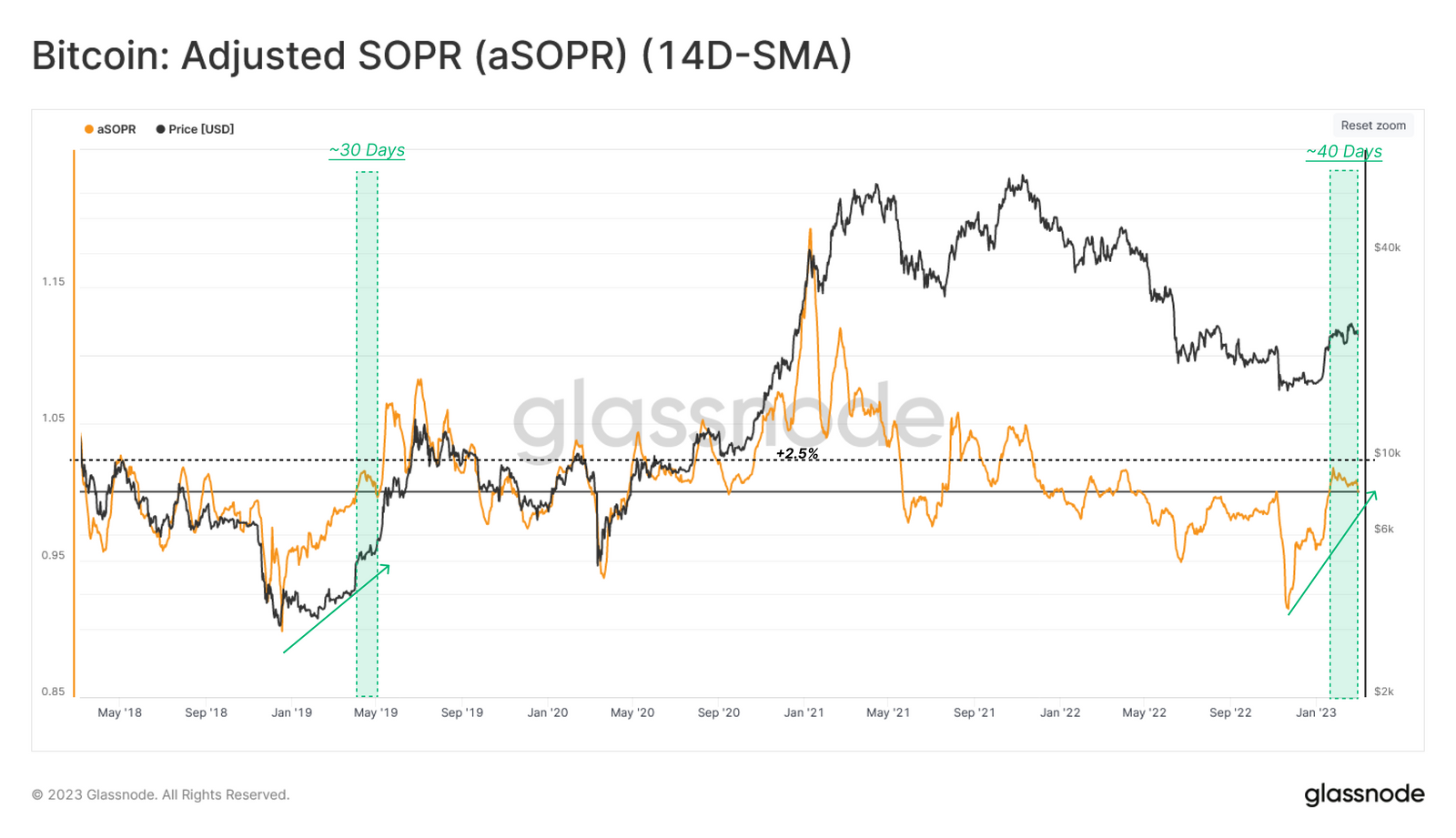 지속적인 기준으로 1.0을 상회하는 aSOPR 거래 수익률은 시장이 심하고 장기간의 손실 기간에서 회복되면서 나타나는 전형적인 특징입니다.
