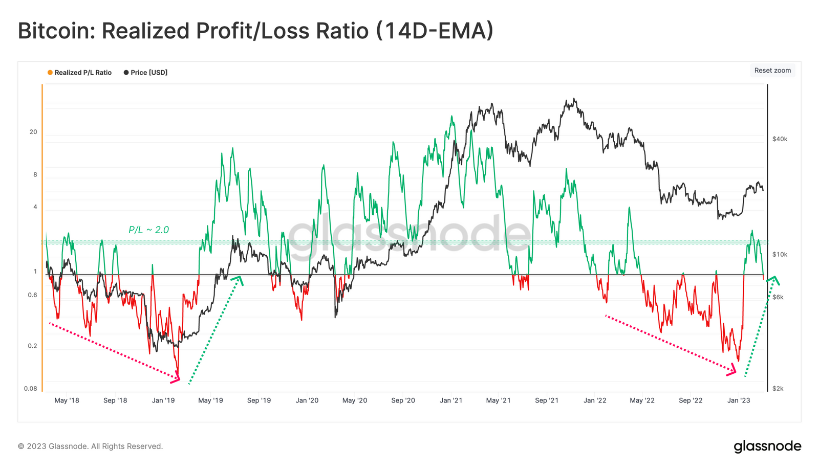 흥미롭게도 실현 손익비율의 상한선은 약 2.0으로, 약세장에서는 이익 실현이 약세 수요를 압도하기 때문에 저항선으로 작용하는 경향이 있습니다. 이 임계값을 넘으면 자본 유입 증가에 대한 보다 강력한 지표가 될 수 있습니다.