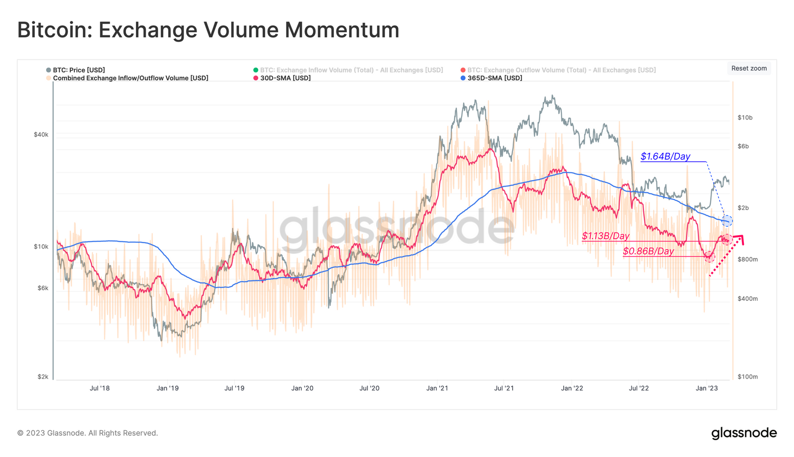 일반적으로 투자자와 트레이더는 자본이 유입됨에 따라 더욱 활발해지기 때문에, 온체인 거래소 거래량과 관련된 유사한 모멘텀 차트로 이러한 관찰을 보완할 수 있습니다. 이 지표를 통해 모멘텀이 상승하기 시작하면서 훨씬 더 가까운 월별 및 연간 평균을 관찰할 수 있습니다. 1월 초부터 월평균 거래소 거래량은 34% 증가했지만, 여전히 연간 평균인 하루 16억 4천만 달러에 미치지 못하고 있습니다.