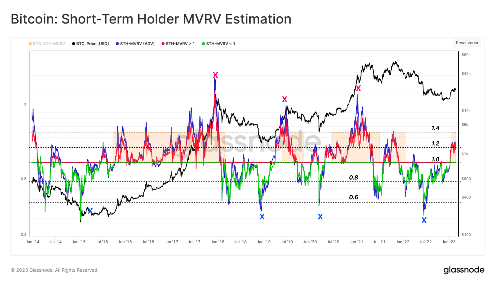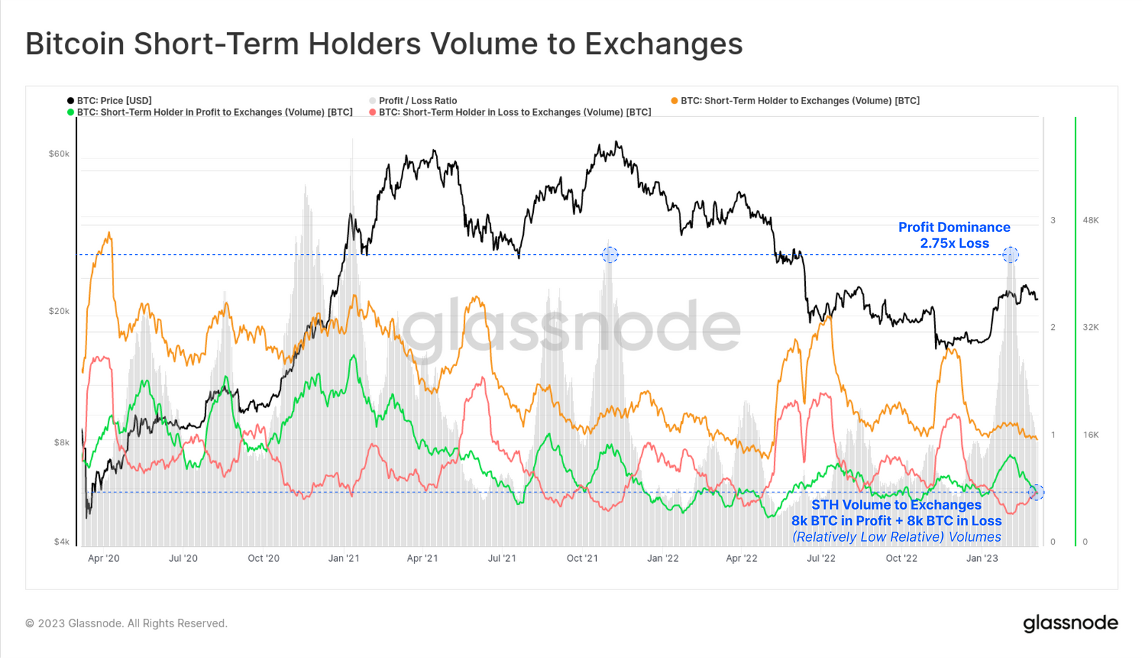 1- 거래소에 전송된 단기 손익 거래량의 비율은 2월 초에 2.75배로 정점을 찍었으며, 이는 2022년 10월 ATH에 해당하는 수치입니다.
