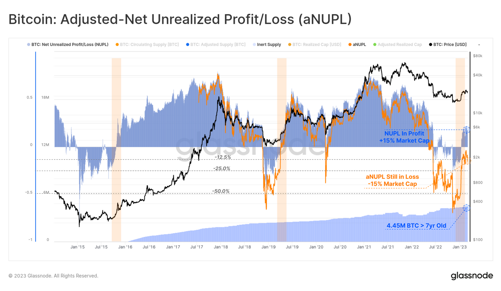 또한, 7년 이상 된 공급량에 고정된 미실현 이익을 빼고 이 지표의 조정된 변동치(aNUPL)를 반환함으로써 손실된 코인을 설명할 수 있습니다 🔵. 이 기준으로 보면 시장은 손익분기점을 간신히 밑돌고 있으며, 여전히 약세장 영역에 있다고 주장할 수 있습니다.