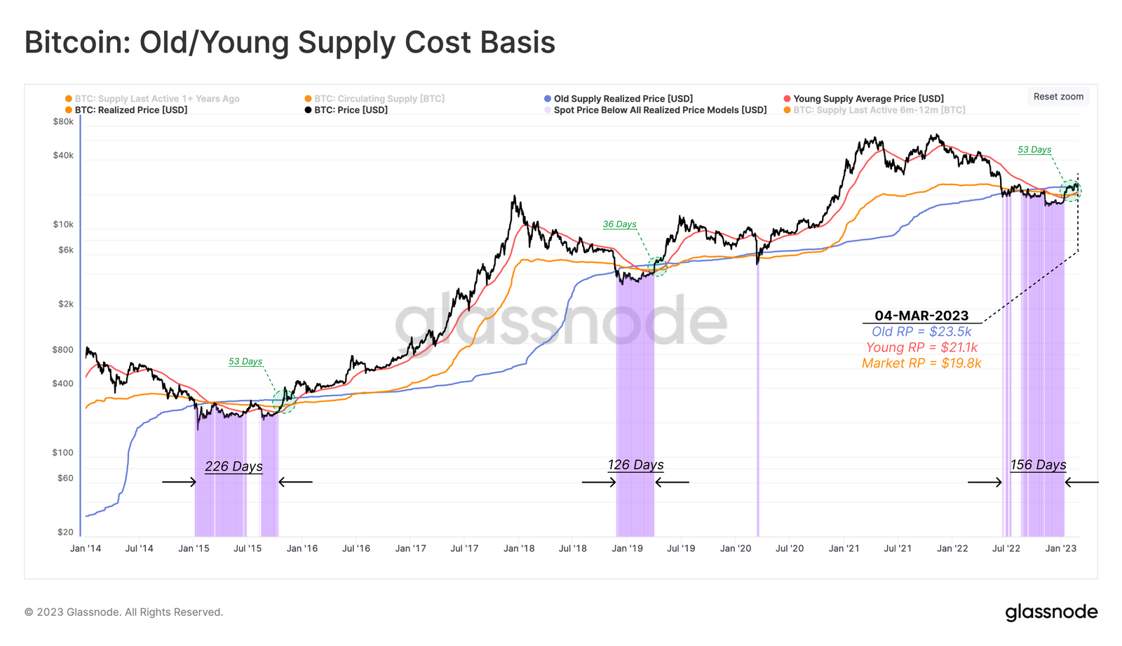 - 🔵구 공급 실현 가격($23.5K): 최소 6개월 이상 보유한 코인의 평균 획득 비용입니다.