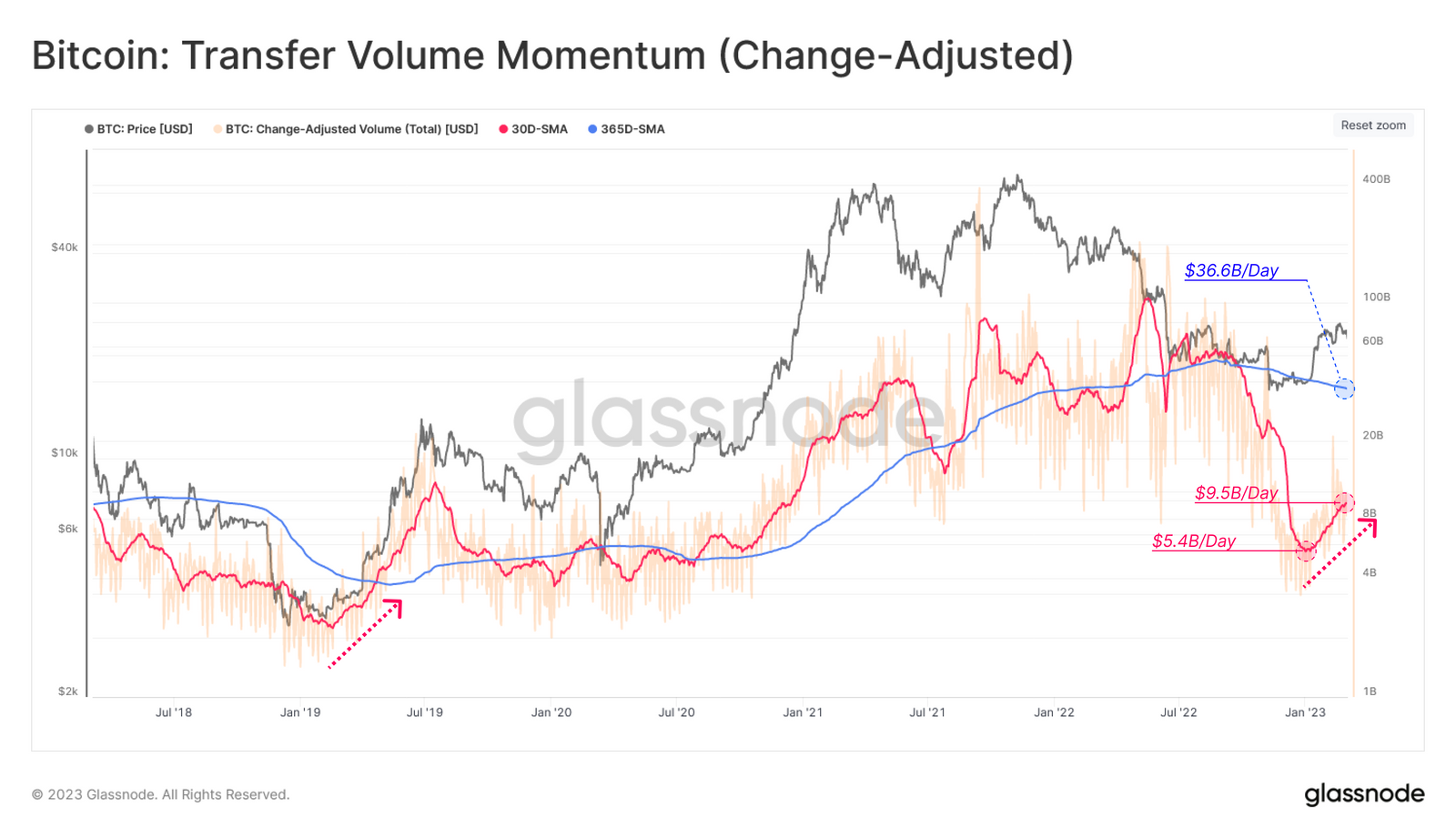 건설적인 전환 단계에서 채택이 증가하는 전형적인 신호는 시장에 새로운 자본이 유치되고 유입되는 것입니다. 시장의 총 자본 수준에 따라 변동하는 경향이 있는 전송량이라는 렌즈를 통해 이러한 모멘텀의 변화를 더 자세히 살펴볼 수 있습니다.