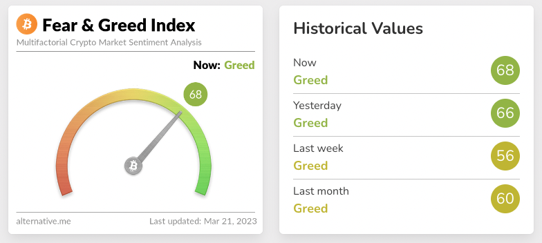비트코인 탐욕-공포지수는 68로 탐욕 단계를 유지하고 있음