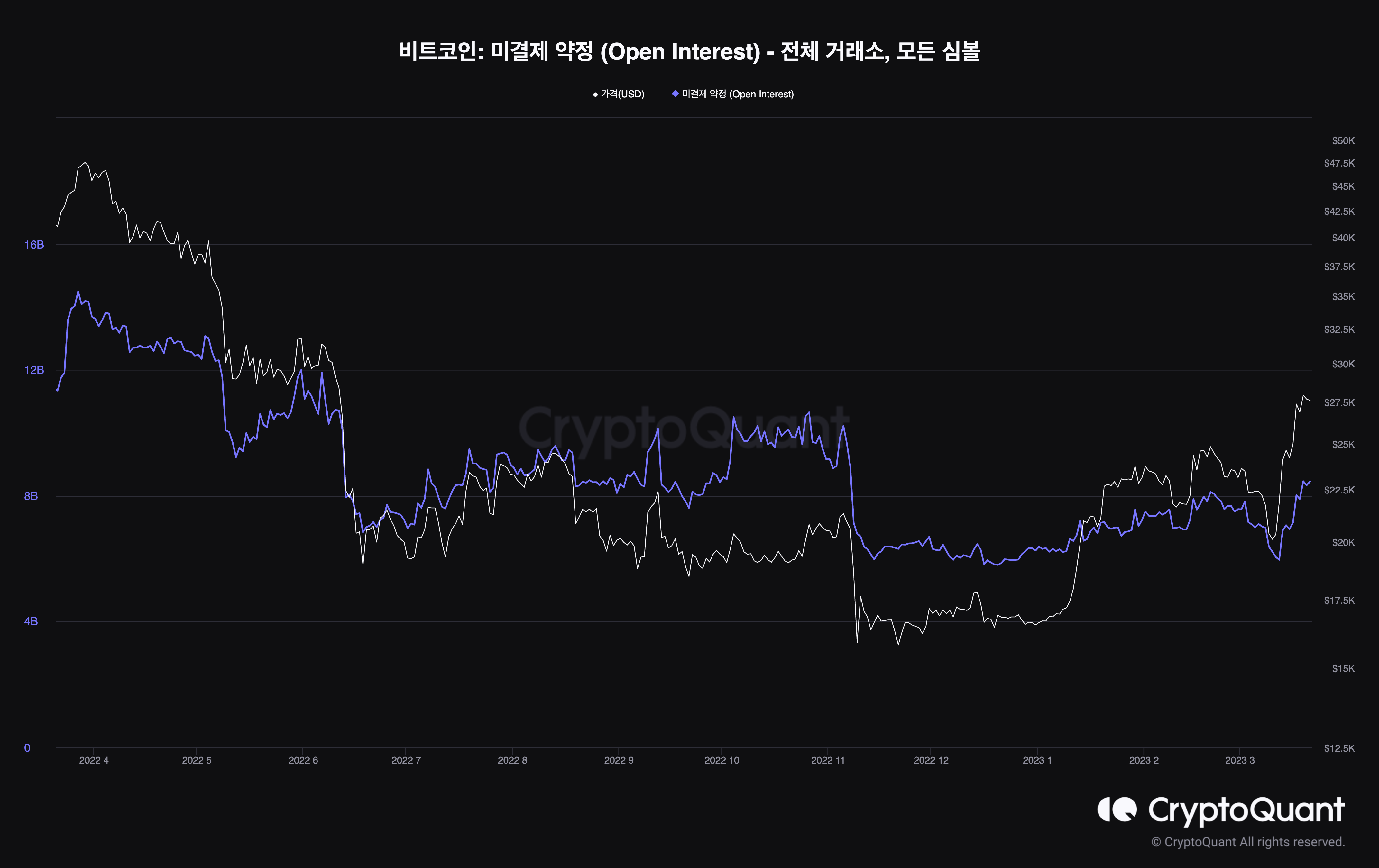 선물 거래소에서 전체 투자자들이 매수(롱)/매도(숏) 포지션을 진입한 뒤에 아직 청산하지 않고 보유중인 모든 계약 수로, 값이 높을수록 시장에 유입된 자금이 많고 시장에 대한 관심이 높다는 것을 의미합니다.