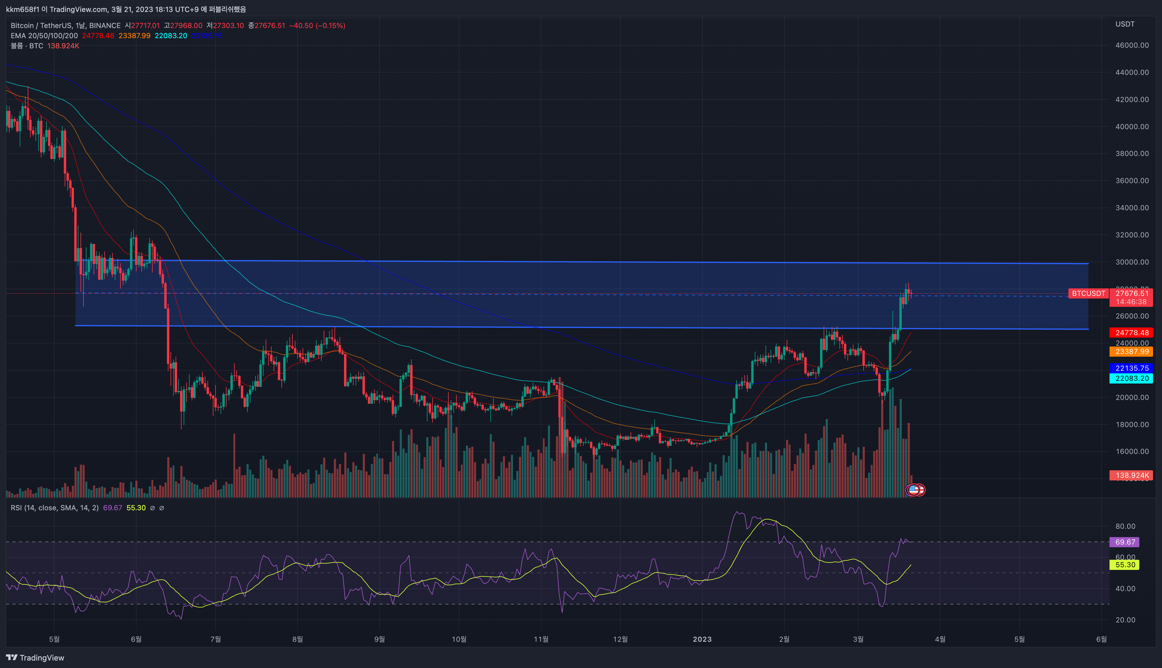 - 비트코인 가격은 21일 오후 6시경 2만7681달러 수준에서 거래중